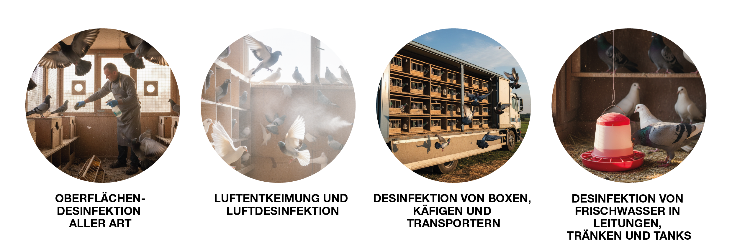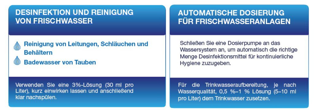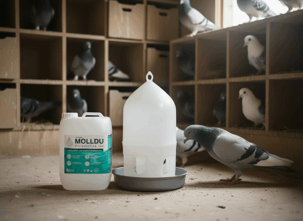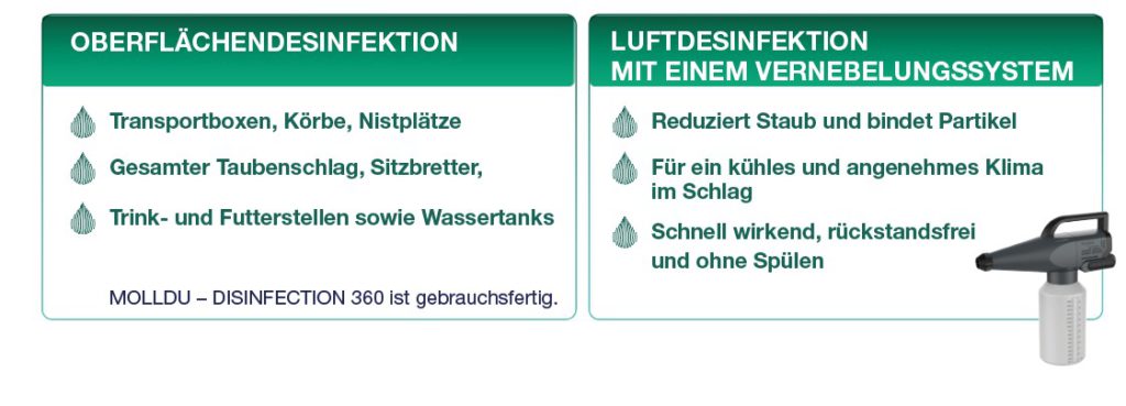 In der Taubenzucht ist Hygiene im Schlag entscheidend – sowohl zur Vorbeugung von Krankheiten als auch für das Wohlbefinden der Tiere. MOLLDU – DISINFECTION 360 bietet eine schonende und zugleich hochwirksame Lösung, die bis zu 99,9999 % aller Erreger abtötet auf Basis von Hypochloriger Säure (HOCl). Es ist ungiftig, alkoholfrei, umweltfreundlich und reduziert Biofilme.