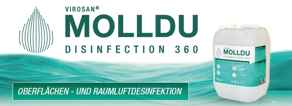 MOLLDU – DISINFECTION 360 desinfiziert und entkeimt Oberflächen sowie die Raumluft von Bakterien, Viren, Pilzen und Sporen – ganz ohne Alkohol.