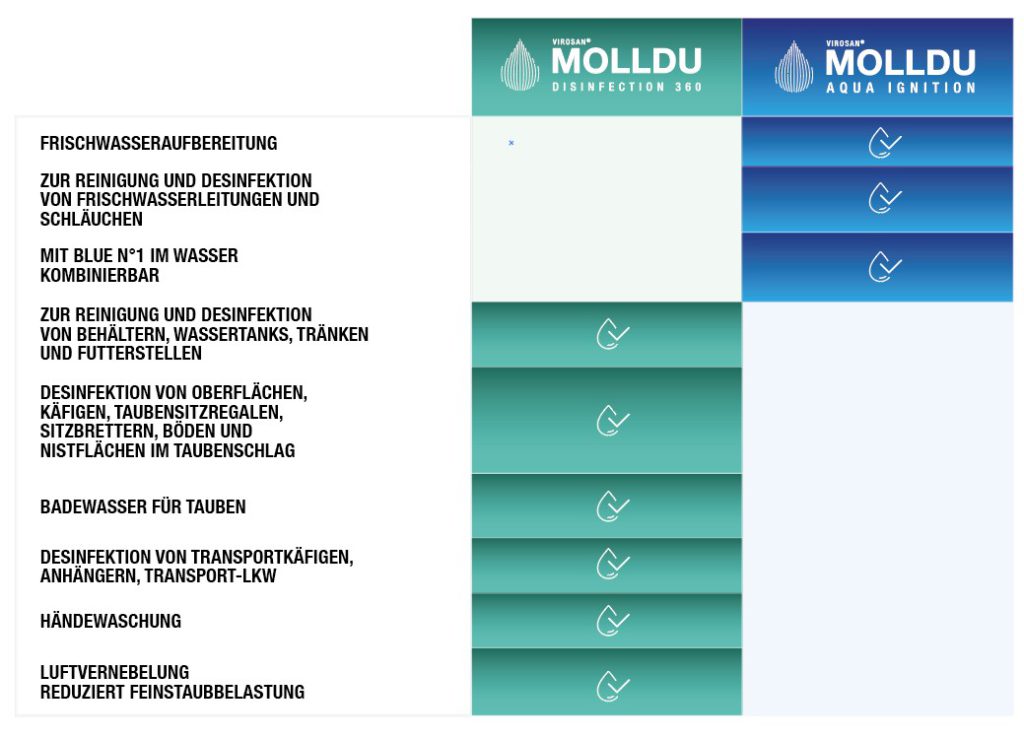 MOLLDU zersetzt sich nach der Anwendung zu Wasser und Salz und ist daher materialschonend, geruchsneutral und rückstandsfrei,– ideal für den kontinuierlichen Einsatz vom Jungtaubenstadium bis zur Mauser.